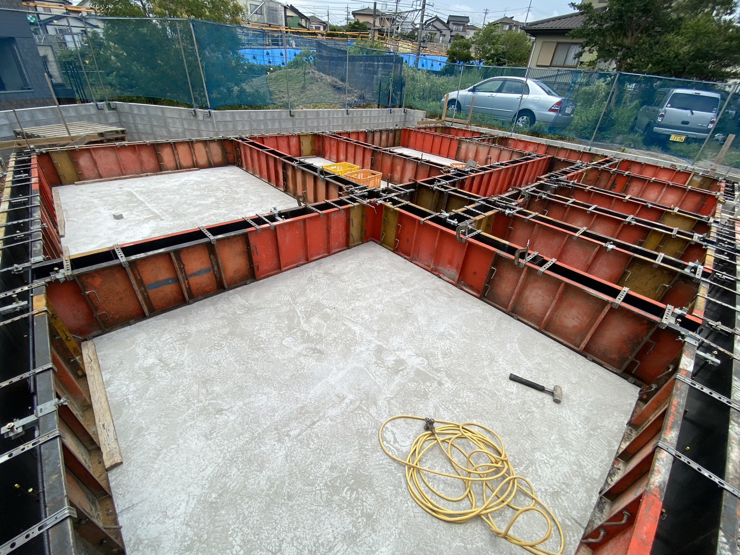 - スラブ打設が完了し、立ち上がり部の型枠が組まれた状態。スラブ面がしっかりと形成されているのが確認できます。