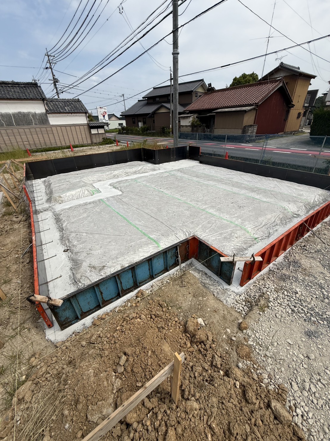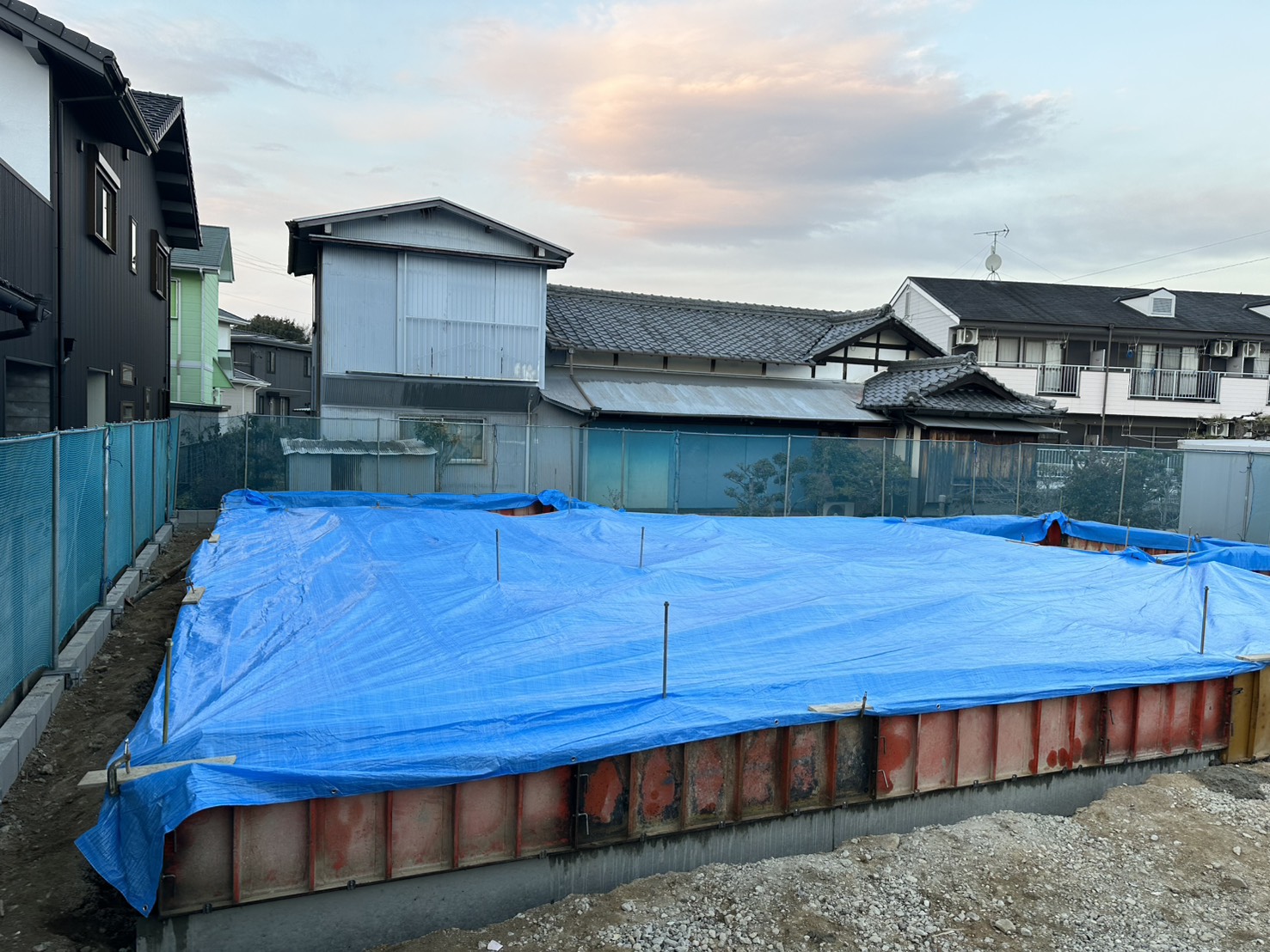 コンクリートを打設した後は、適切な養生を行うことが設計通りの強度を発現させるうえで不可欠です。打設直後はポリシートでスラブ全面を覆い、表面の急激な乾燥を防ぎます。さらにブルーシートで全体を包み、外気温の変化や直射日光・降雨からコンクリートを保護します。この養生期間中にコンクリート内部では水和反応(硬化反応)が着実に進み、所定の強度が確保されていきます。養生の丁寧さが、完成後の基礎の耐久性に直結する重要な工程です。